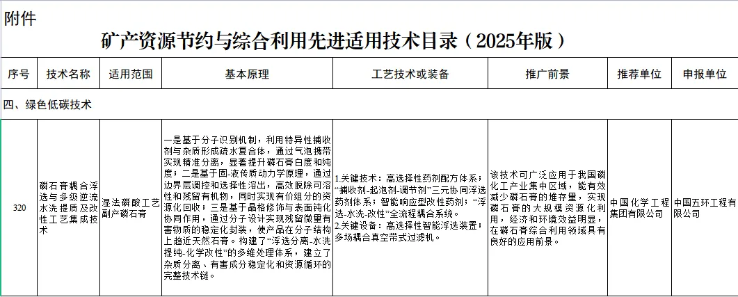 近日,自然资源部正式发布《矿产资源节约与综合利用先进适用技术目录(2025年版)》,中国化学工程所属中国五环工程有限公司自主研发的“磷石膏耦合浮选与多级逆流水洗提质及改性工艺集成技术”成功入选化工矿产类绿色低碳技术。