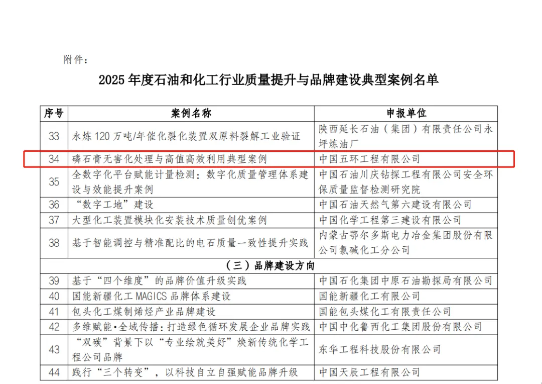 1月12日,中国石油和化学工业联合会公布2025年度石油和化工行业质量提升与品牌建设典型案例名单,中国化学工程所属中国五环工程有限公司申报的案例《磷石膏无害化处理与高值高效利用典型案例》从众多参赛案例中脱颖而出,成功入选为50项质量提升与品牌建设典型案例(质量技术创新应用方向)之一。此次入选,是对公司以技术创新夯实品牌根基、以品牌建设赋能高质量发展实践的充分肯定。