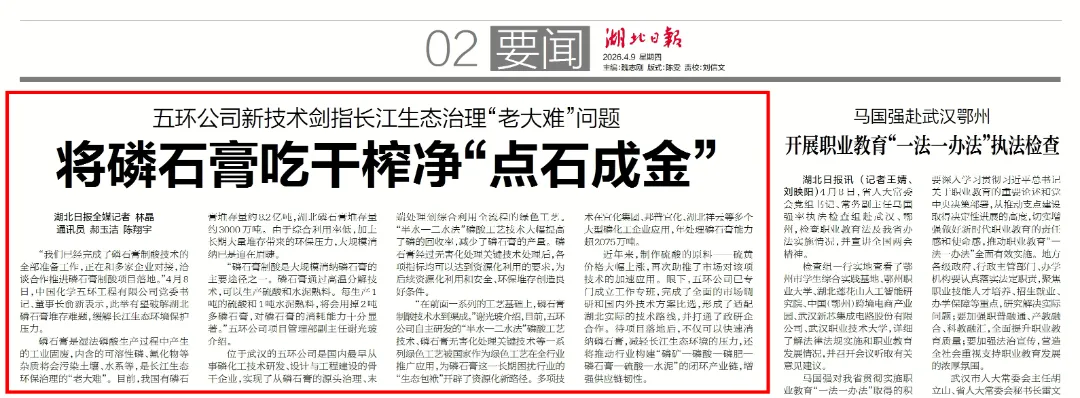 4月9日,湖北日报以《破解磷石膏“老大难”,五环公司已备好“钥匙”》为题进行专题报道,肯定五环在磷石膏规模化、资源化利用方面的探索。磷石膏制酸是大规模消纳磷石膏的主要途径之一——采用磷石膏制酸联产水泥工艺,每消耗约2吨磷石膏,可生产1吨硫酸并副产1吨水泥熟料。