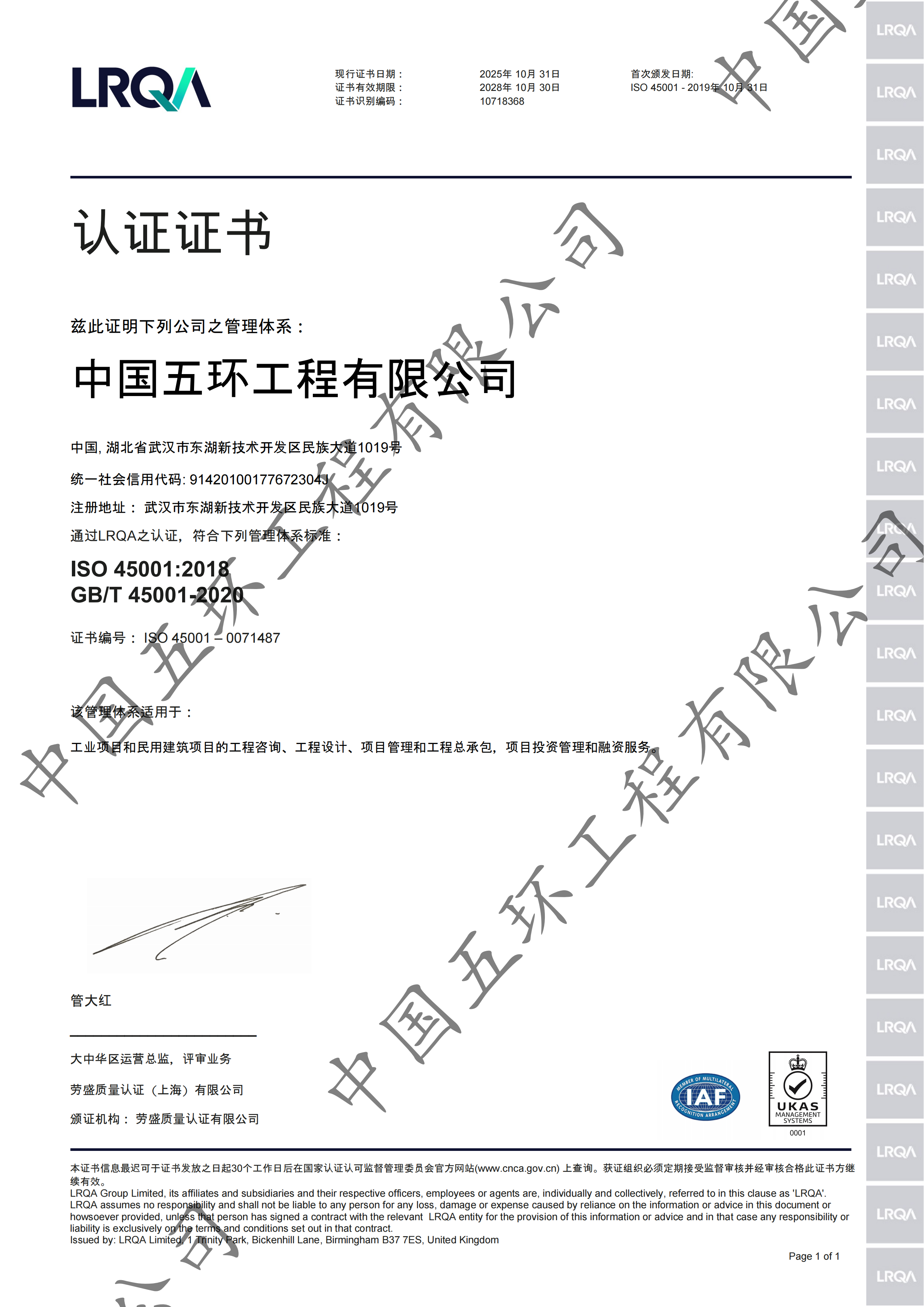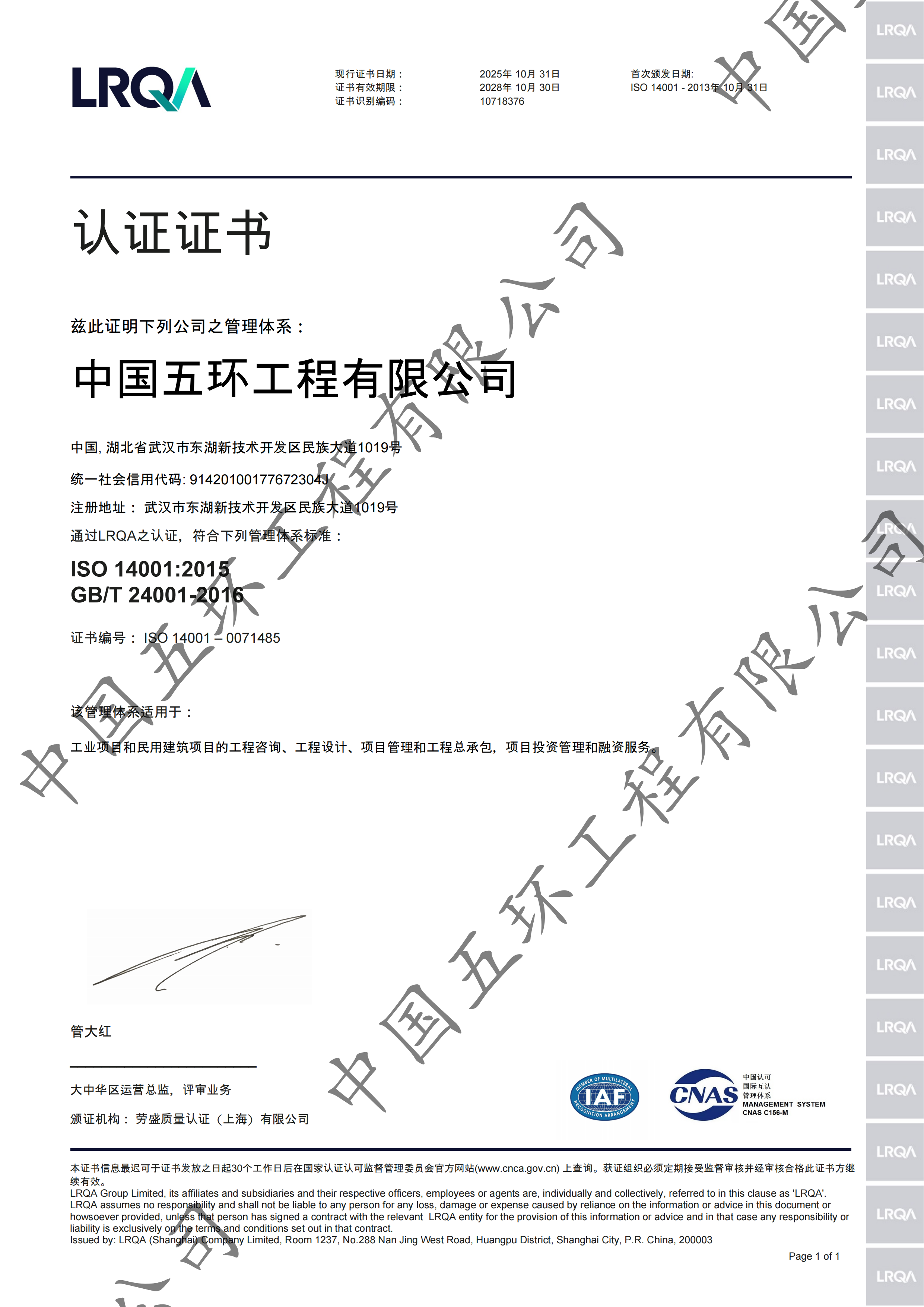中国五环高度重视QHSE管理,建立了国内一流的工程公司QHSE管理体系。获得了英国劳氏质量认证(上海)有限公司颁发的质量管理体系、环境管理体系、职业健康安全管理体系三项证书,高质量的体系运行管理已成为行业内典范。